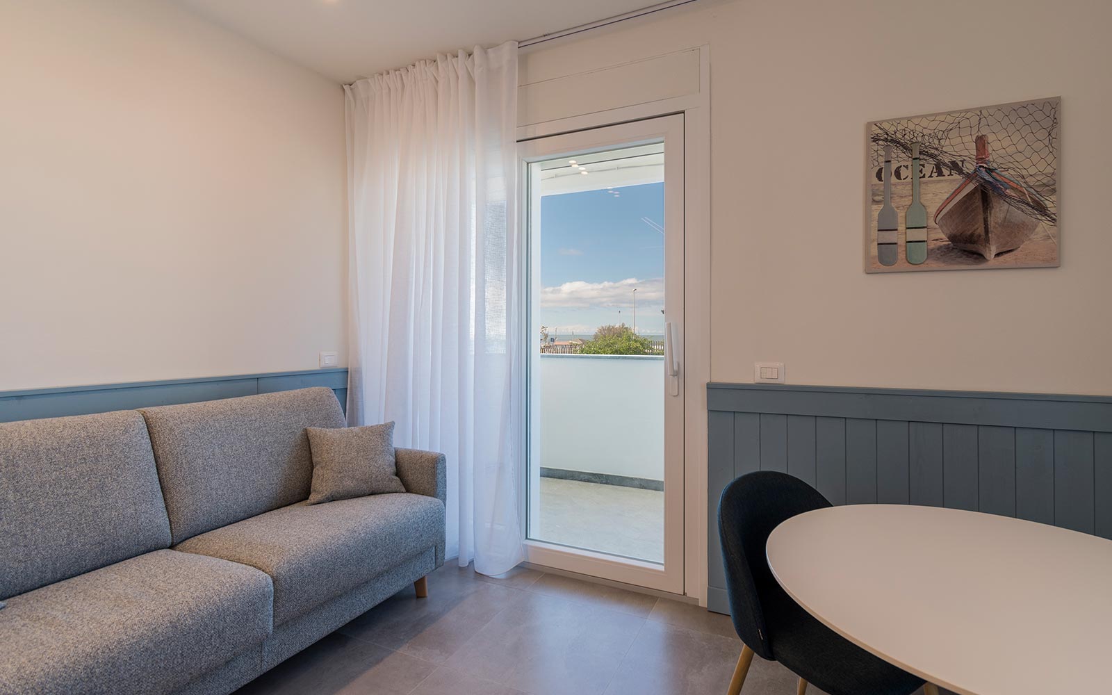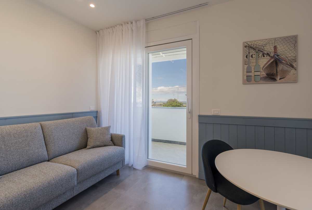 Il nostro Appartamento Bilocale Superior dispone di n.3 terrazze private, fra cui una fronte mare e una vista montagne. Una di queste terrazze è grande circa 30mq ed è arredata con salotto relax e tavolo da pranzo per godersi un pranzo vista mare.